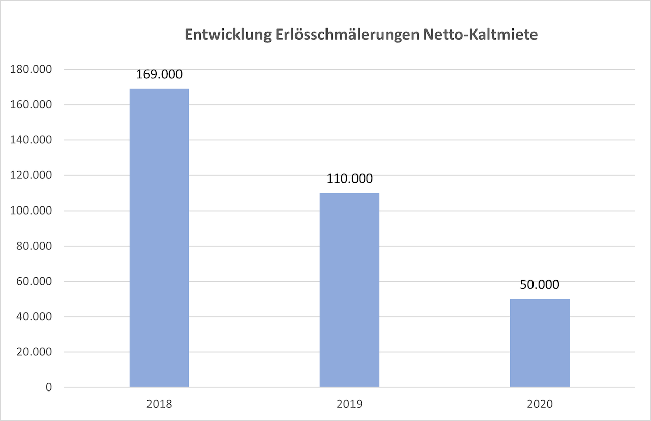 Insgesamt betrugen die leerstandsbedingten Erlösschmälerungen der Nettokaltmiete im Geschäftsjahr 2020 lediglich 2 Prozent.