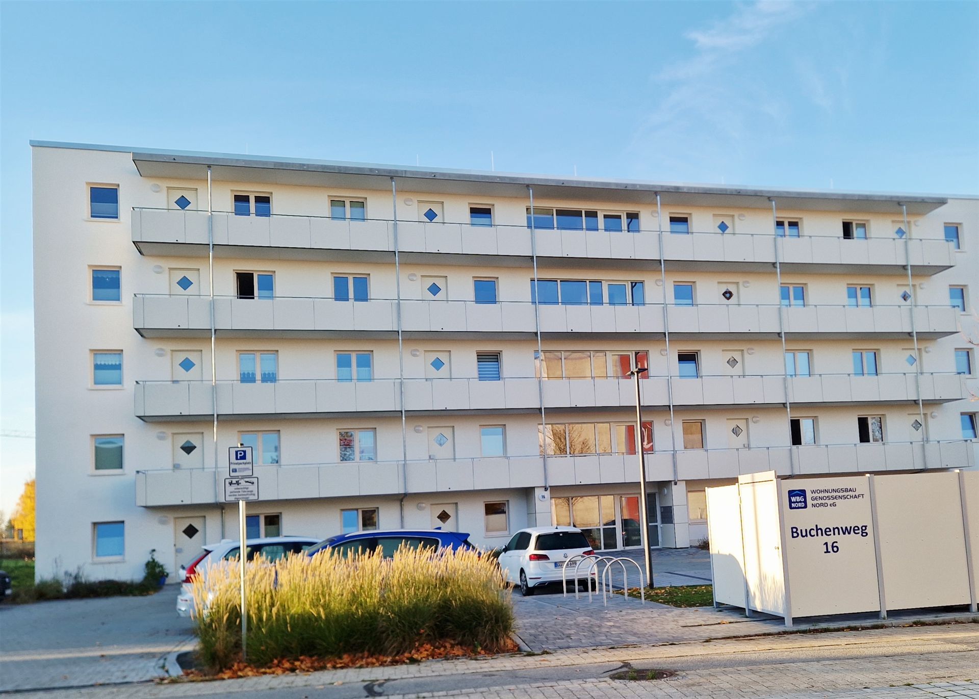 Wir haben unser Neubauprojekt mit 20 altengerechten Wohnungen und einer Gesamtinvestitionssumme von über 5 Millionen Euro in der Güstrower Nordstadt im Buchenweg 16 im Mai fertiggestellt und zum 1. Juni die Wohnungen übergeben. Aufgrund der sehr guten wirtschaftlichen Lage unserer Genossenschaft und einer genauen Finanzplanung konnte das Projekt vollständig aus Eigenmitteln finanziert werden. Die Zeit- und Kostenplanung wurde exakt eingehalten. Alle Wohnungen sind vermietet. Die zukünftigen jährlichen Mieteinnahmen von ca. 180 T€ (Steigerung der Mieteinnahmen unserer Genossenschaft um ca. 7 %) kommen nun allen Mitgliedern unserer Genossenschaft für Instandhaltungsmaßnahmen und zur Vermeidung von Mieterhöhungen zugute.