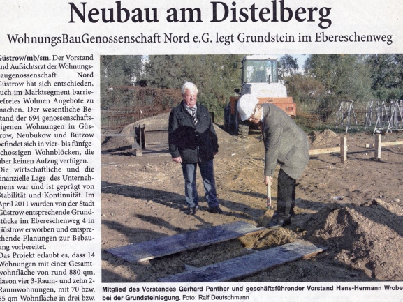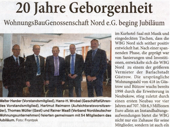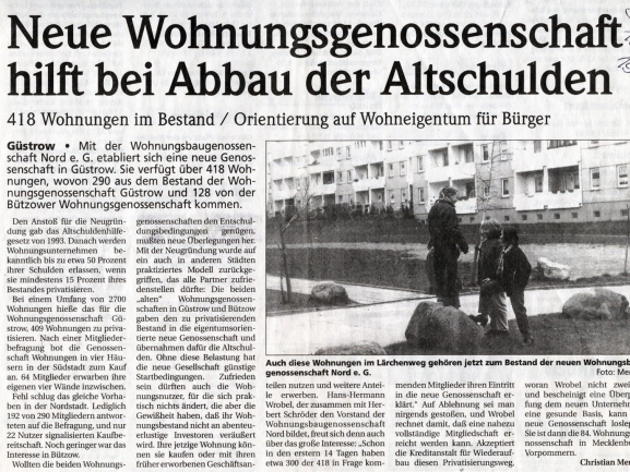 Am 20.11.1996 fand die Gründungsveranstaltung unserer WohnungsBauGenossenschaft Nord e.G. in Güstrow statt. Danach erwarb unsere Genossenschaft größere Wohnungsbestände von der Güstrower und Bützower Wohnungsgenossenschaft, die damit ihre Privatisierungsverpflichtungen erfüllten.